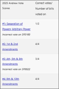 A legislator’s constitutional competence is presented on a Constitutional Bill Vote Scorecard that shows eight constitutional categories (categories such as the Separation of Governmental Powers, First Amendment, Second Amendment, etc.). The score in each category is a numeric value of the legislator’s vote record on previous bills specific to that topic.